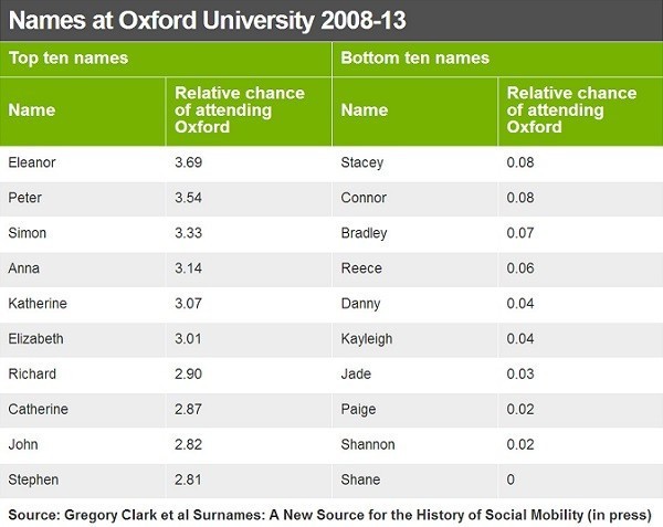 Σε αντίστοιχο συμπέρασμα έχει καταλήξει και ο Gregory Clark, ο οικονομολόγος πίσω από το βιβλίο με τίτλο “The Son Also Rises: Surnames and the History of Social Mobility”. Παρά το γεγονός ότι είχε εστιάσει περισσότερο την προσοχή του στα επίθετα, ο Clark ασχολήθηκε και με τα πρώτα ονόματα, κυρίως των 14.449 πρωτοετών φοιτητών του Πανεπιστημίου της Οξφόρδης από το 2008 έως το 2013.