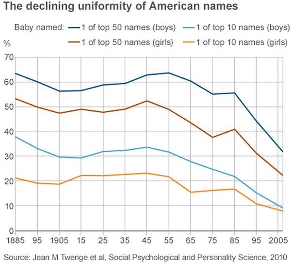 Αντίστοιχη είναι η κατάσταση και στις Ηνωμένες Πολιτείες, όπου το 1950 περίπου το 5% των γονέων επέλεγαν όνομα για το παιδί τους που δεν βρισκόταν ανάμεσα στα 1000 πιο συνηθισμένα. Το 2012, το ποσοστό αυτό έφτασε το 27%.